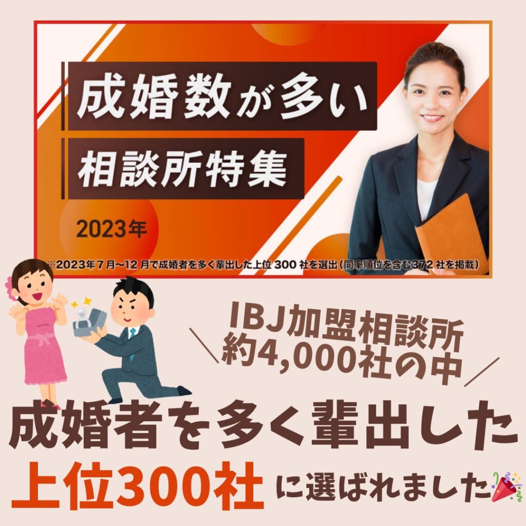 4,000社を超えるIBJ加盟相談所の中から『成婚者を多く輩出した上位300社』の評価をいただきました。